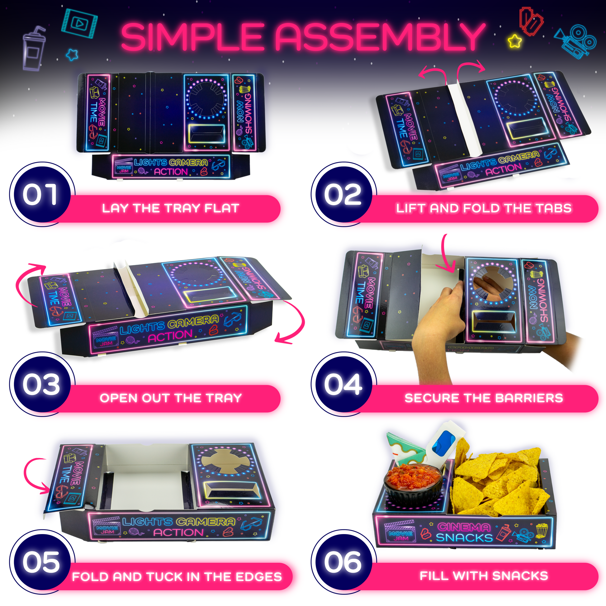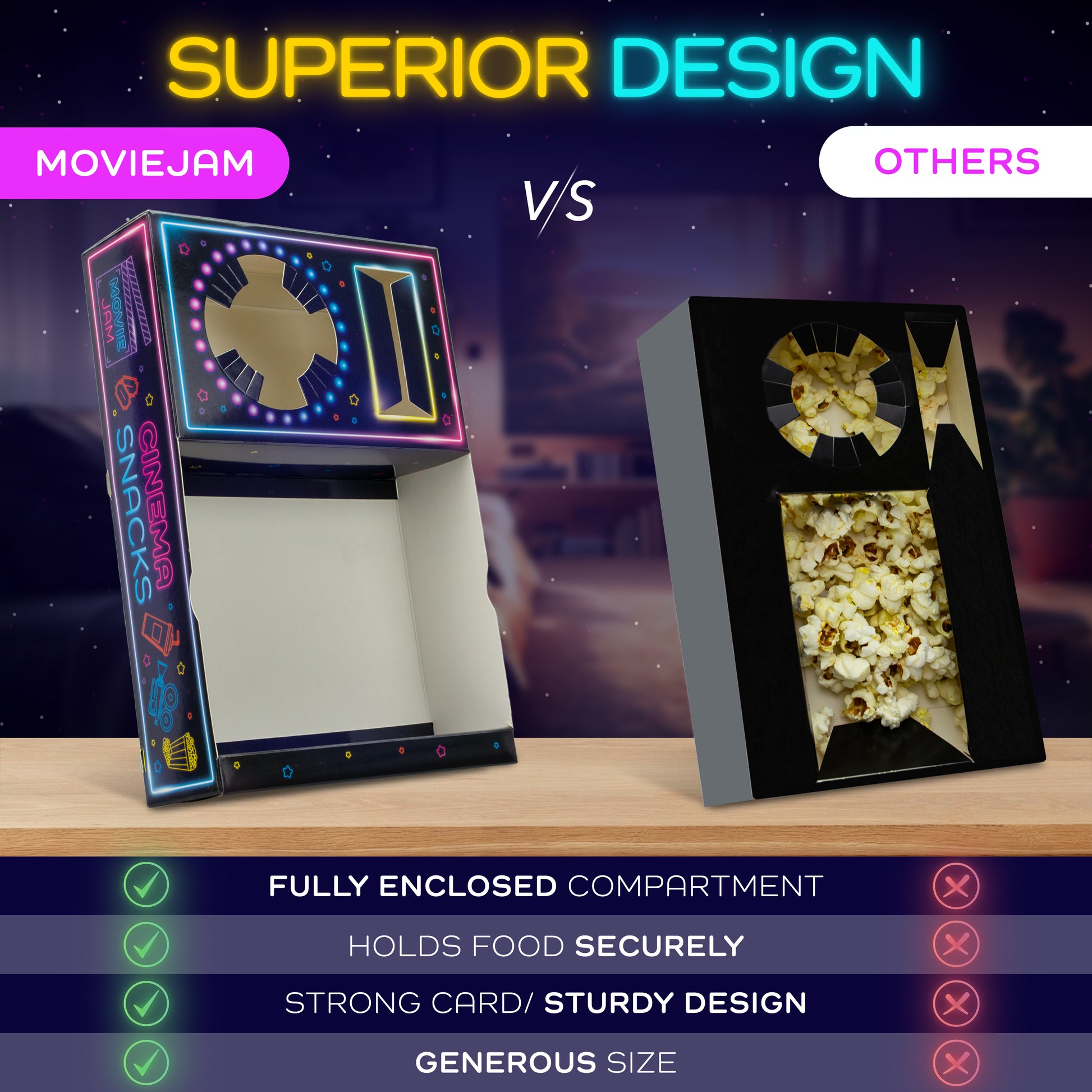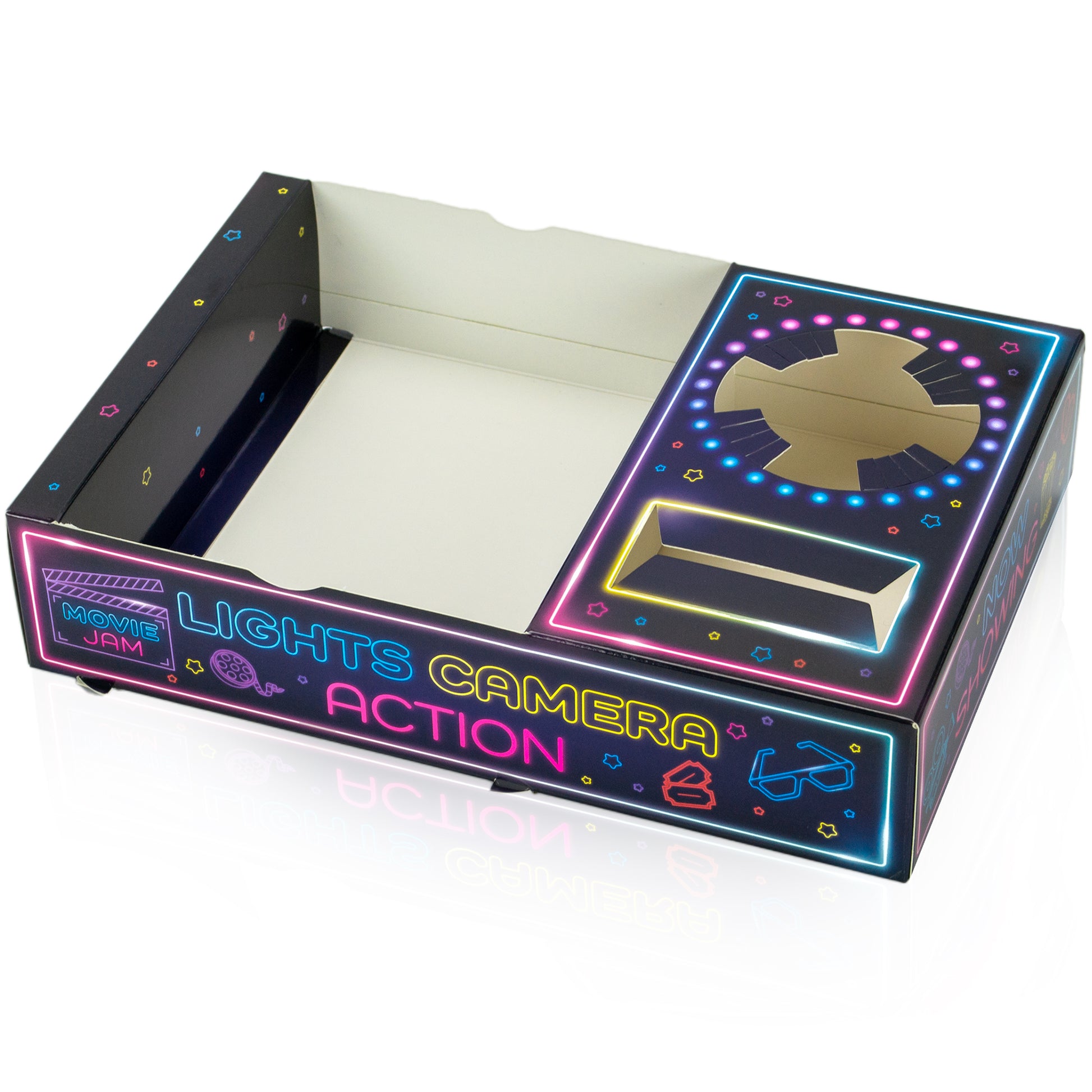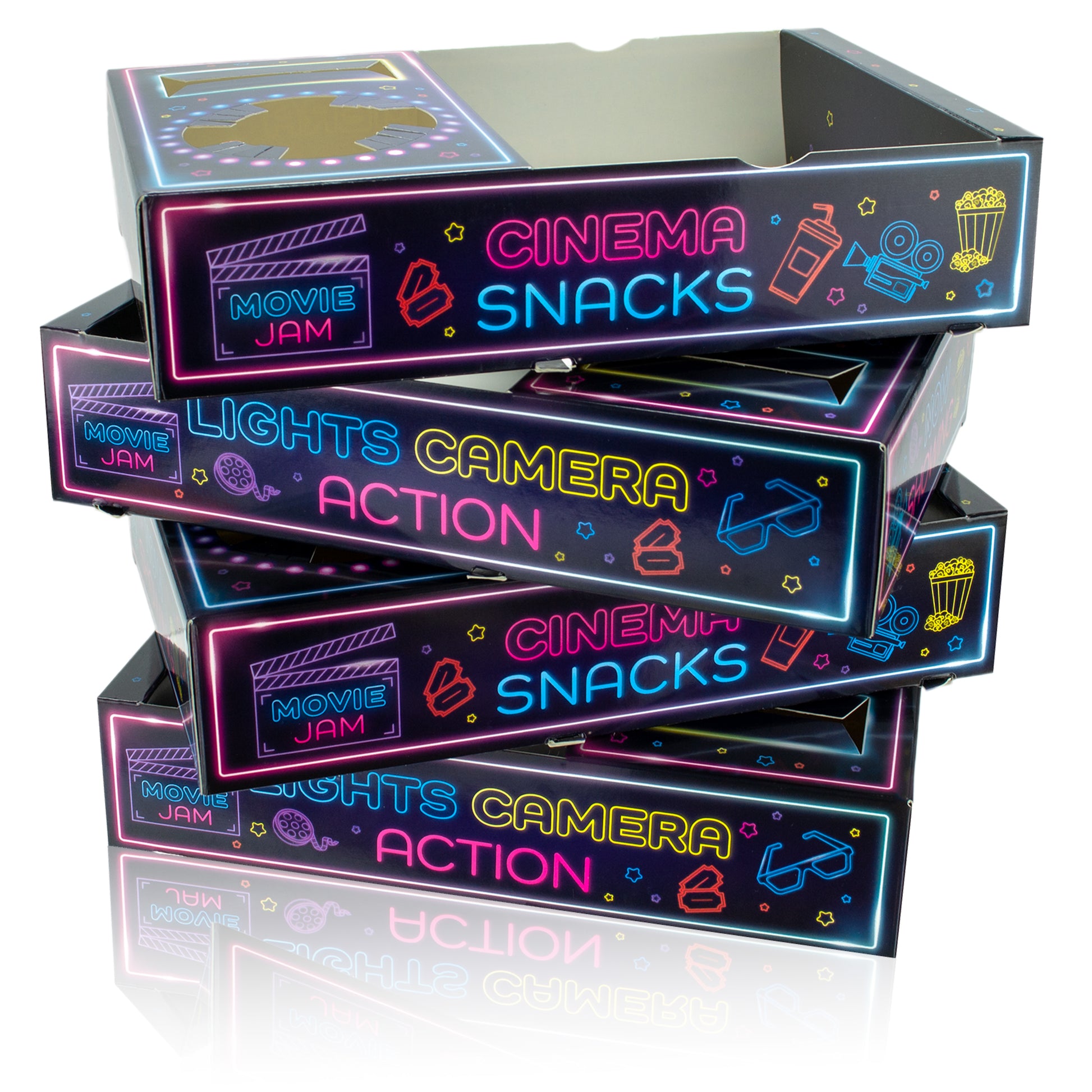 MovieJam Movie Night Snack Trays – Neon Edition | 10 Durable Popcorn Boxes, 10 Candy Bags & Free Movie Ticket Invitations