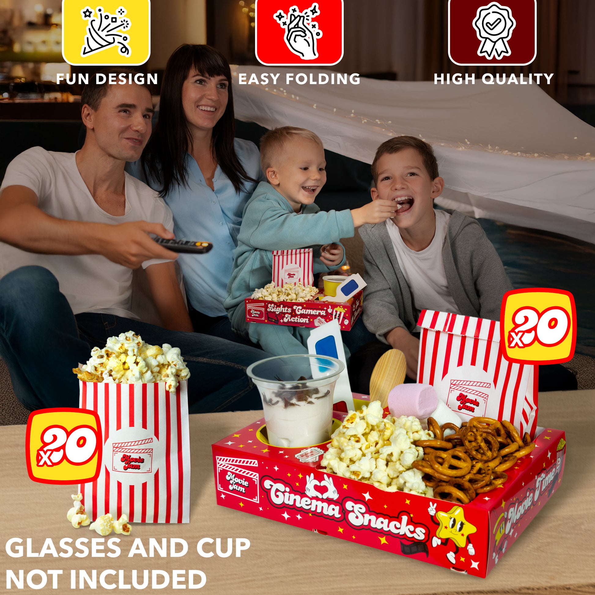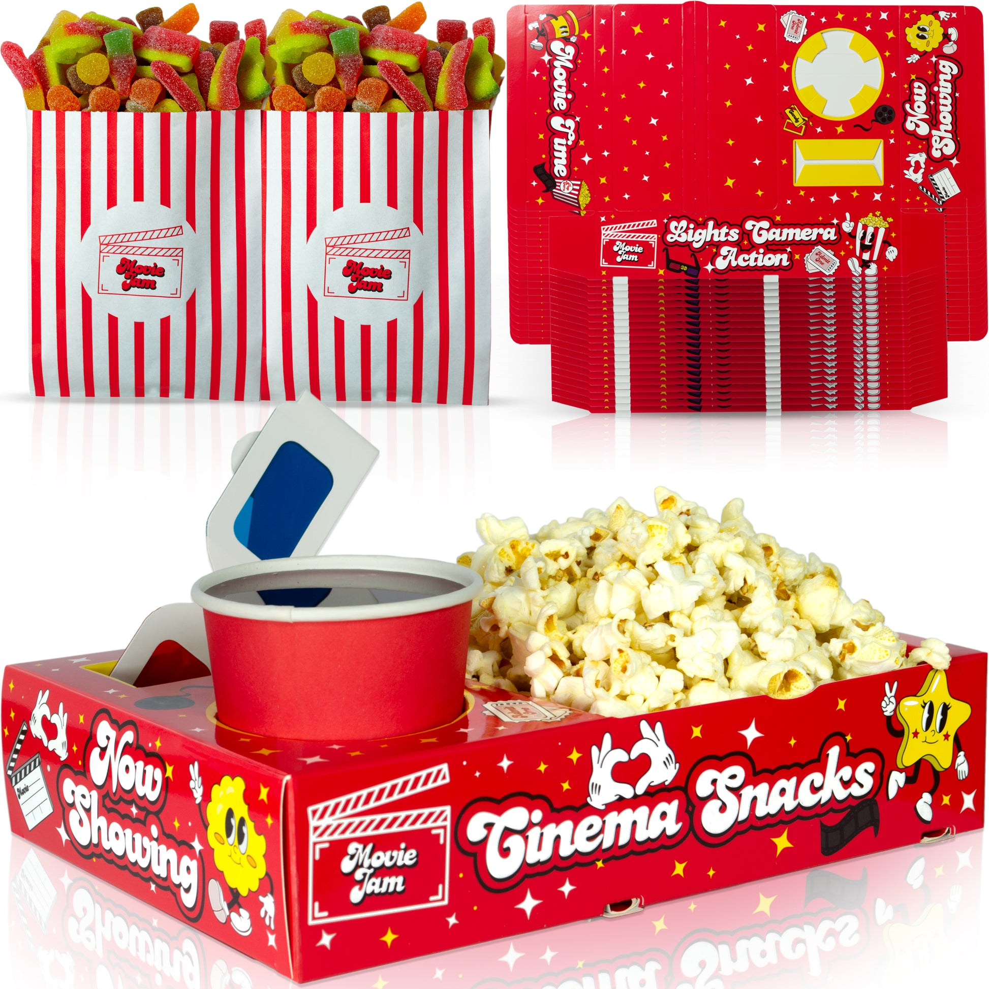 MovieJam Movie Night Snack Trays – Red Edition | 20 Durable Popcorn Boxes, 20 Candy Bags & Free Movie Ticket Invitations